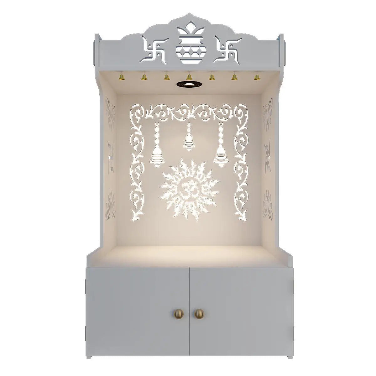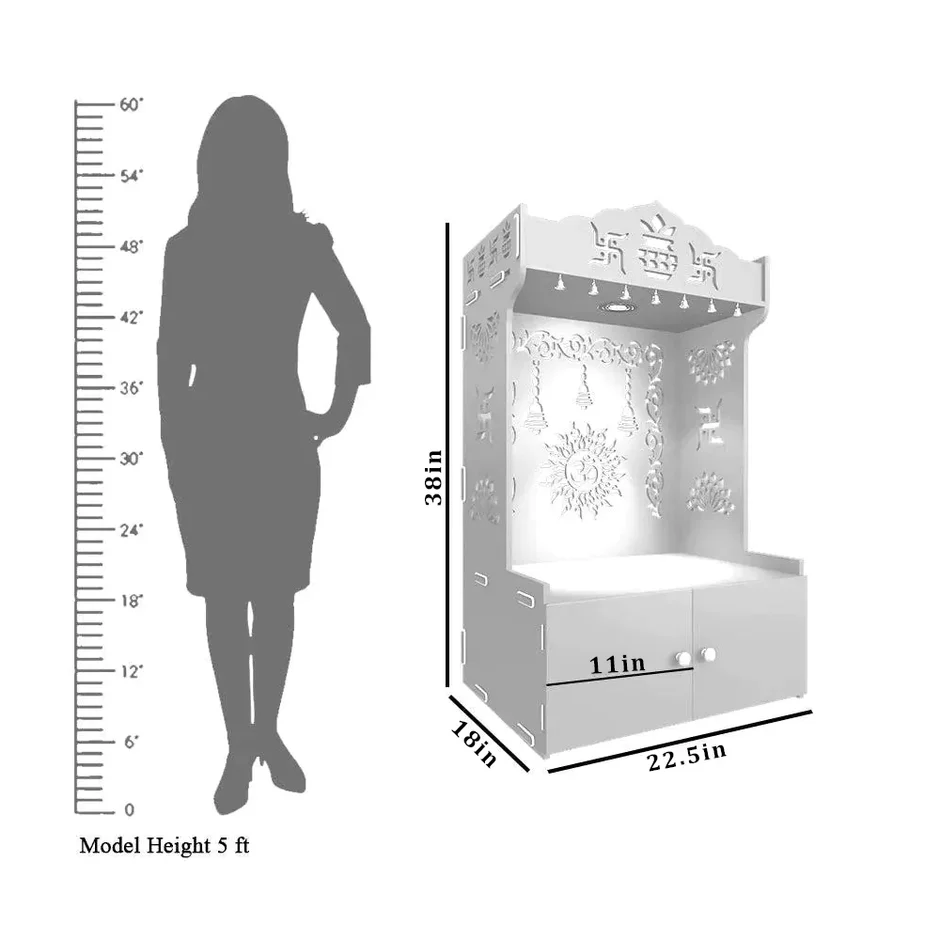 Aesthetic White Wooden Temple for Home with Spacious Shelf & Inbuilt Focus Light