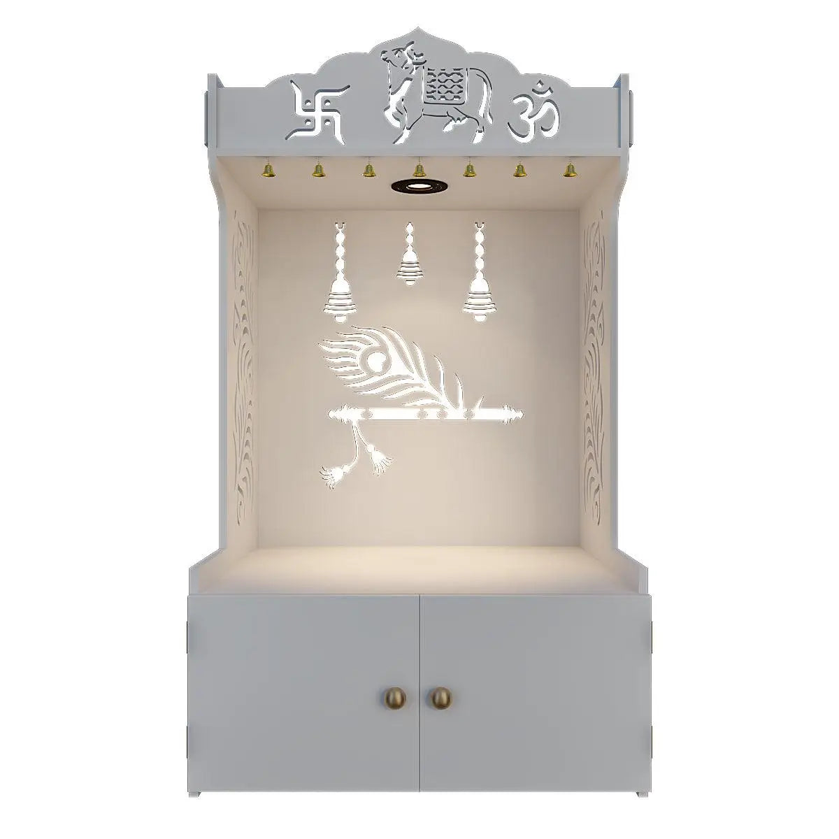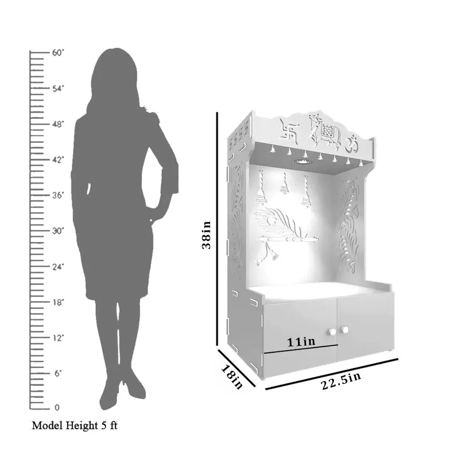 Gracious Mor Pankh Wooden Temple With Spacious Shelf & Inbuilt Focus Light - White Color