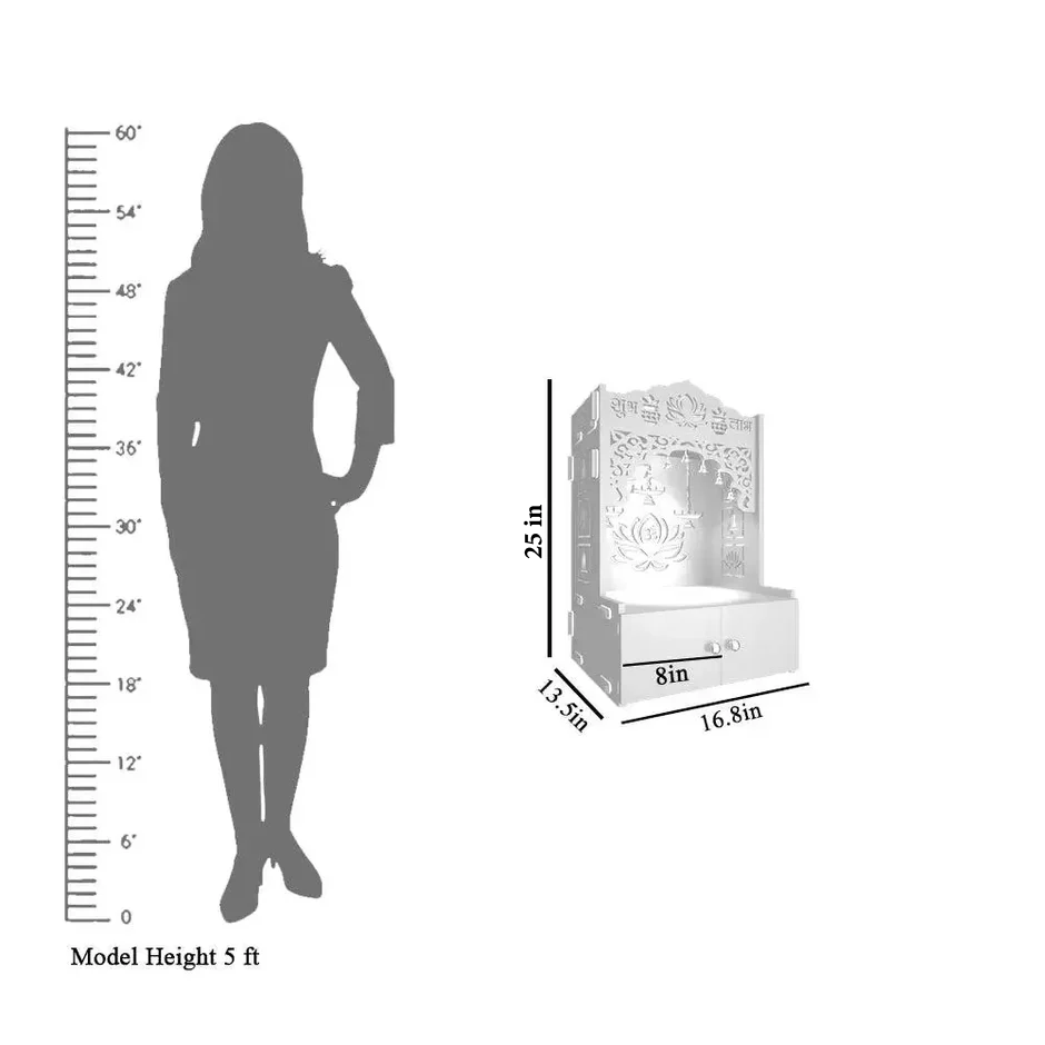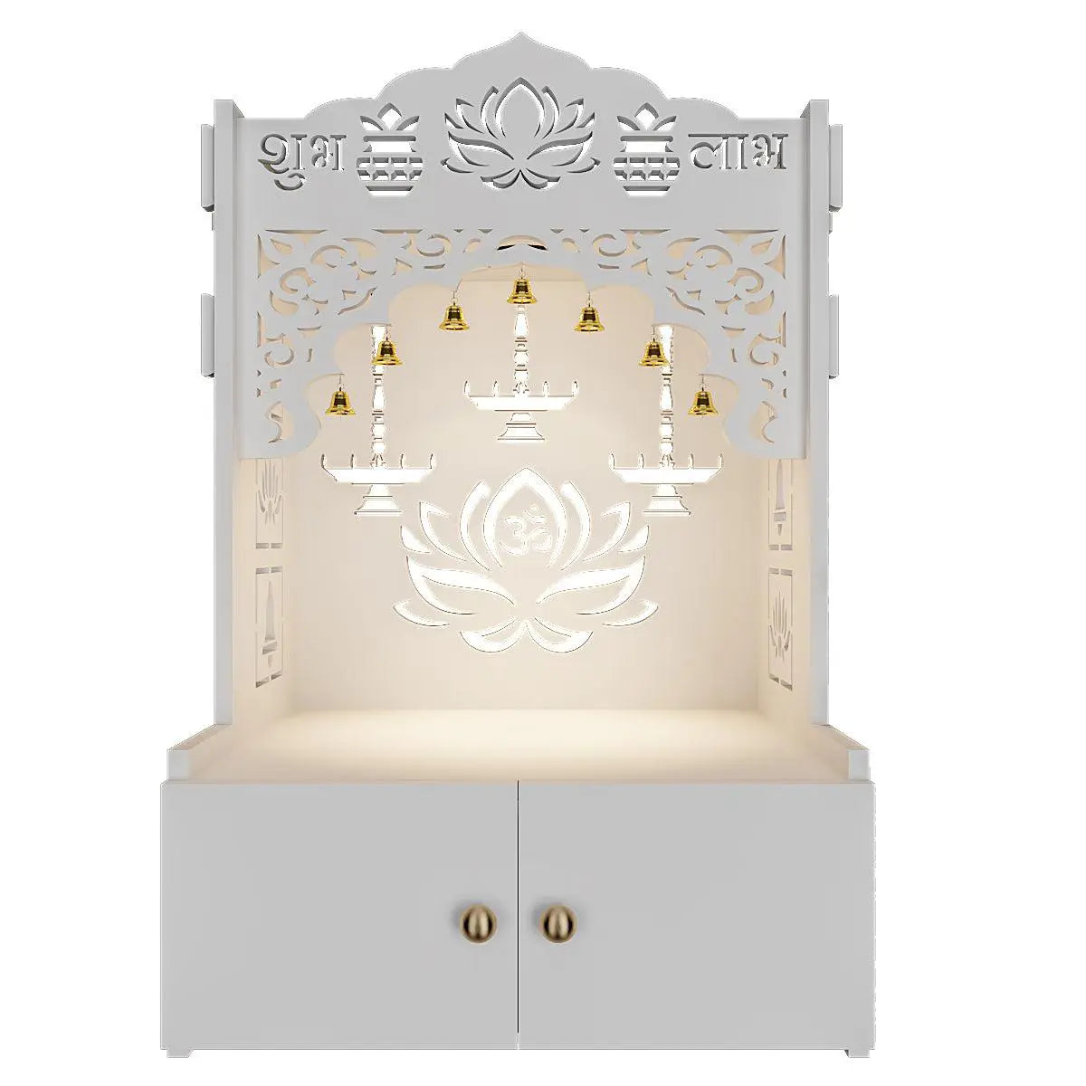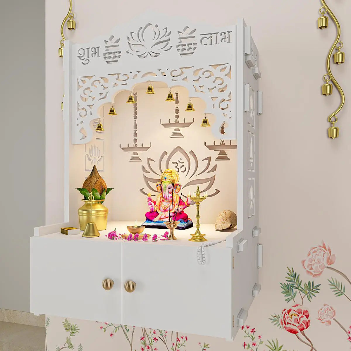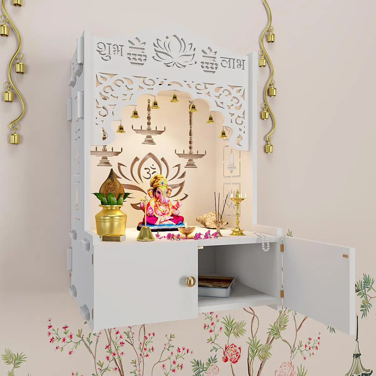 Lotus White Finish Wooden Wall Mounted Temple for Home with Inbuilt Focus Light & Spacious shelf