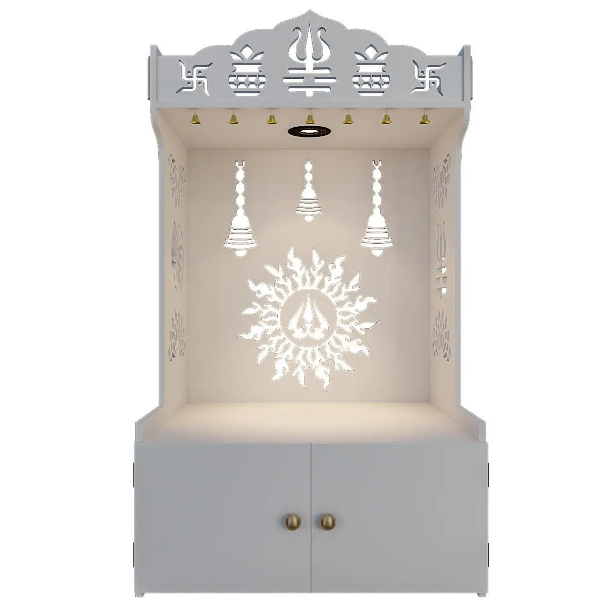 Radiance of Surya Chakra Wooden Home Temple with Spacious Shelf & Inbuilt Focus Light - White Color